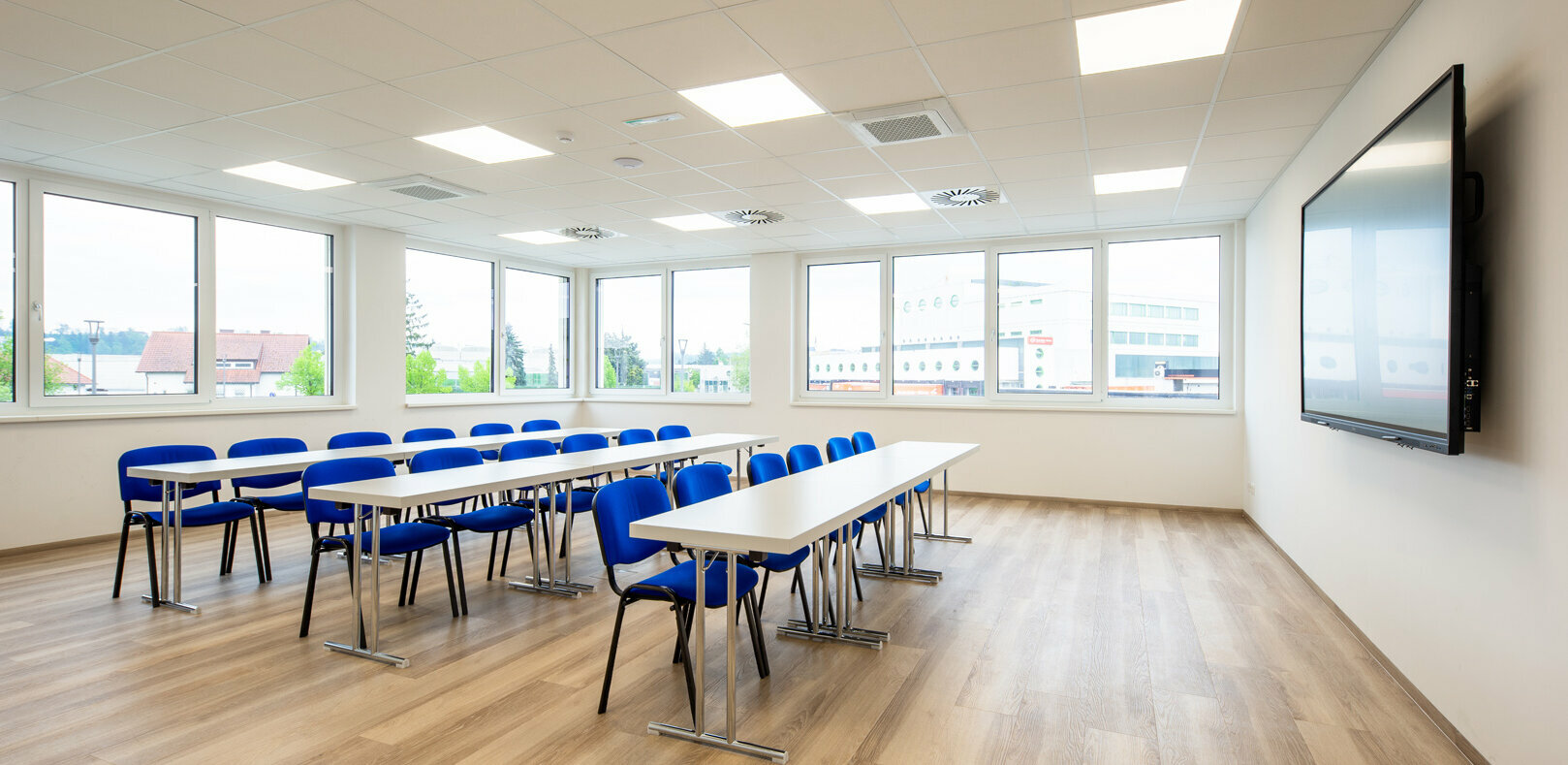 Optional: Mobile screen (65’ 4K LED with audio and digital whiteboard function), flipchart, whiteboard
