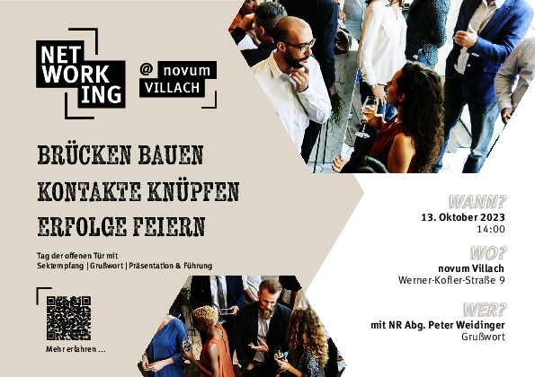 Brücken bauen - Kontakte knüpfen - Erfolge feiern ... Das Bildungs- und Veranstaltungszentrum novum Villach öffnet seine Türen und lädt zum Netzwerken bei einem Glas Sekt und Fingerfood ein. Gerne führen wir Sie durch unsere neue novum Location und zeigen Ihnen, welche Möglichkeiten diese Räumlichkeiten für Sie und Ihr Event bereithalten.