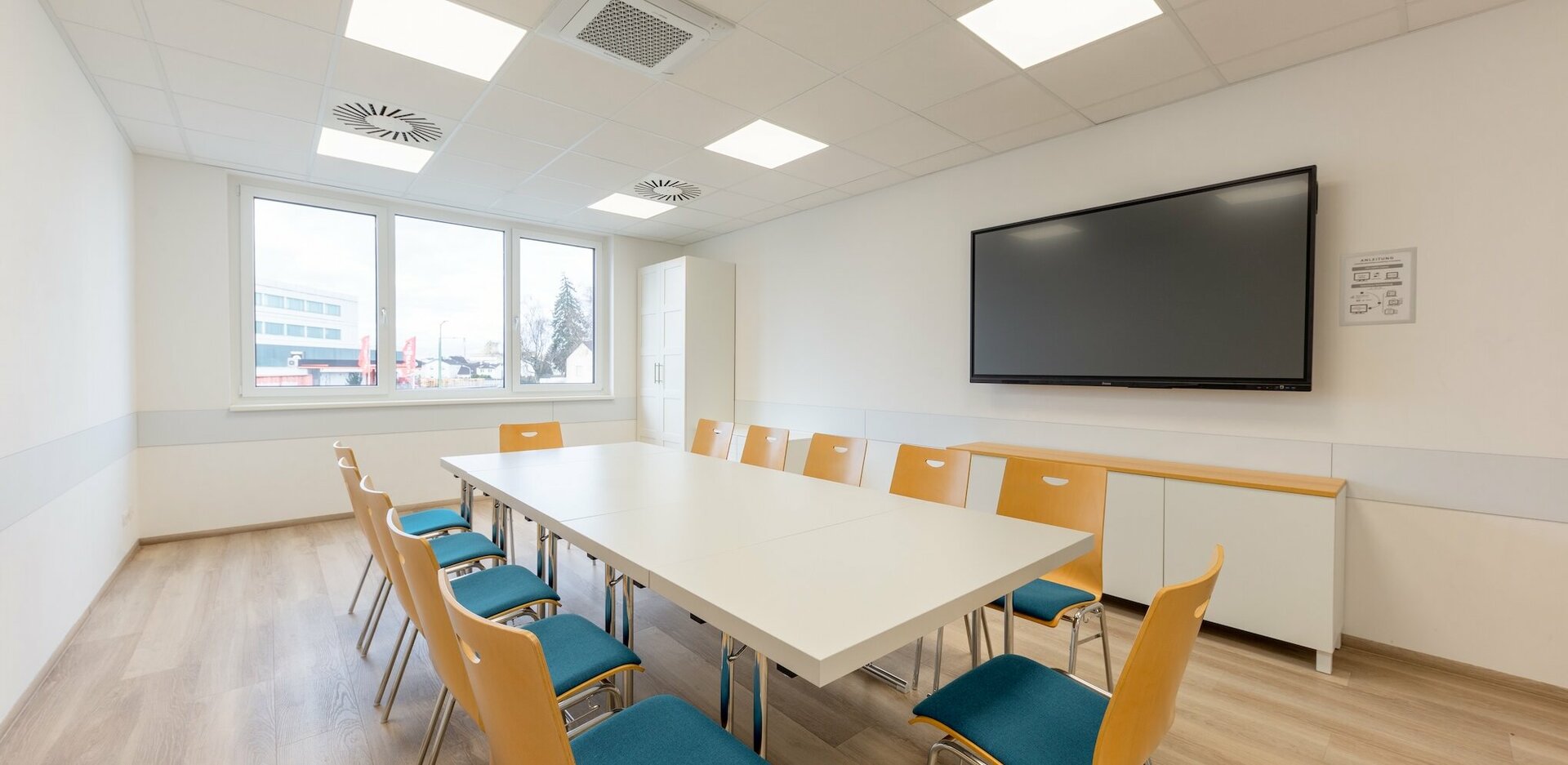Optional: Mobiler Screen (55“ 4K-LED mit Audio und digitaler Whiteboard-Funktion), Flipchart, Whiteboard